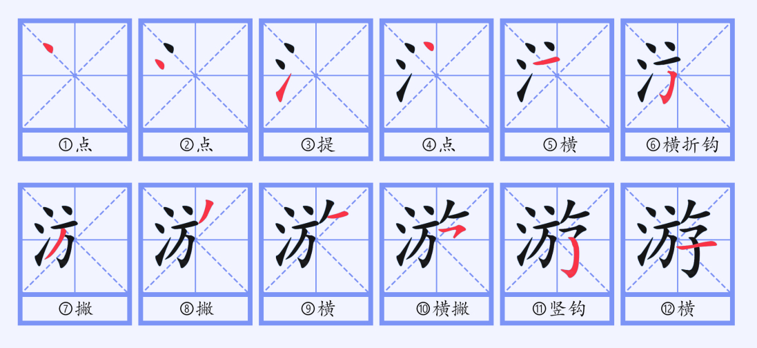 游(拼音:yóu)是汉语一级通用规范汉字(常用字) [1]。此字在甲骨文和商周金文中写作“斿”,模拟一子立于旌旗之下,后加上“氵(水)”旁成为“游”字 [2]。“游”的本义一般认为是旗帜的垂饰,读liú。后转指水流,引申为不固定的、经常移动的。“游”也指河流的一段。人或动物在水中活动也称为“游”。