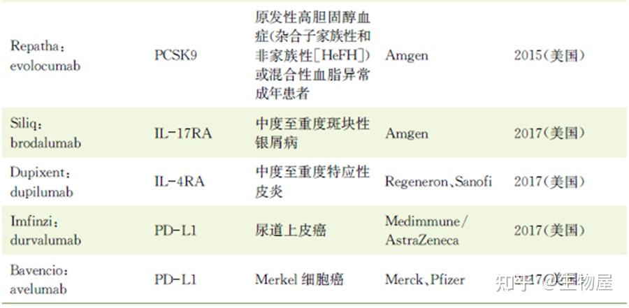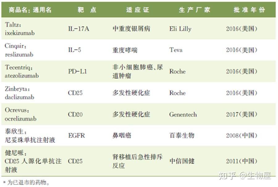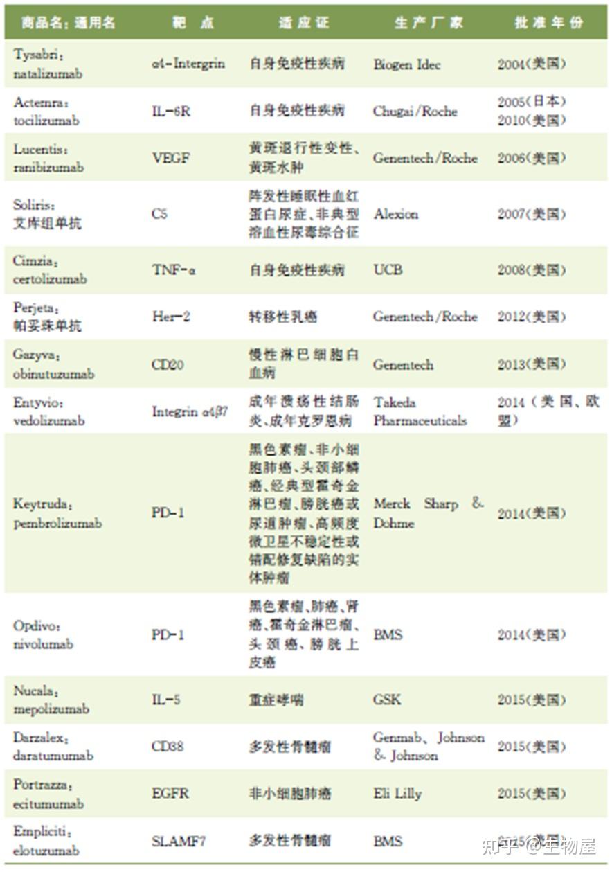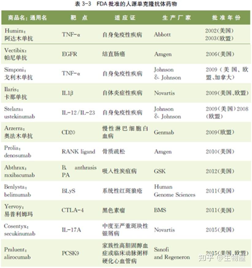· 目前FDA及中国食品药品监督管理总局(CFDA)批准的人源化单克隆抗体药物如表3-2所示。