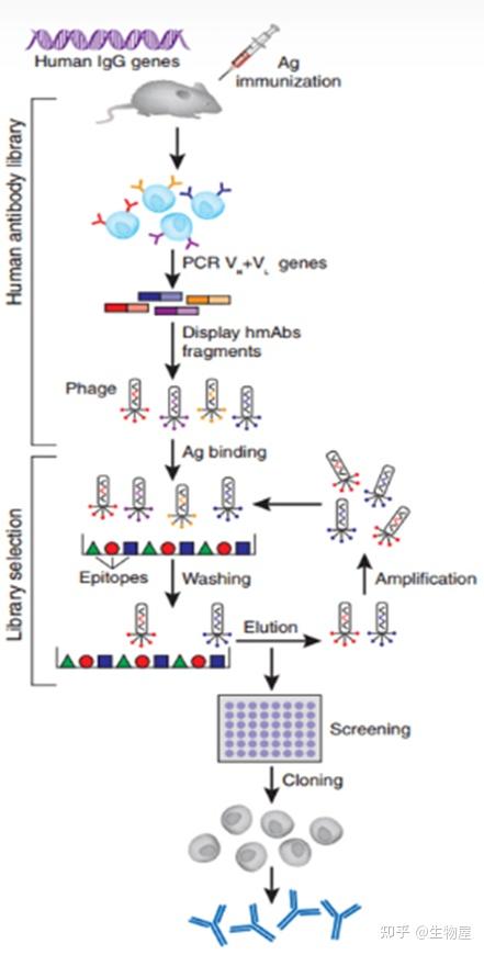 · 基因工程人源抗体制备技术包括抗体库制备技术、转基因小鼠抗体制备技术、人人杂交瘤技术、EB病毒转化人B[淋巴]细胞技术和单个B细胞抗体制备技术等。目前,使用最多的是噬菌体抗体库展示技术和转基因小鼠抗体制备技术。抗体库制备技术的出现开创了一条简便、快捷的基因工程抗体生产路线,为人源抗体的制备开辟了新途径,是抗体工程史上的里程碑。抗体库制备技术主要包括噬菌体抗体库展示技术和核糖体展示技术,如阿达木单抗就是应用噬菌体抗体库展示技术制备的第一个人源抗体药物。