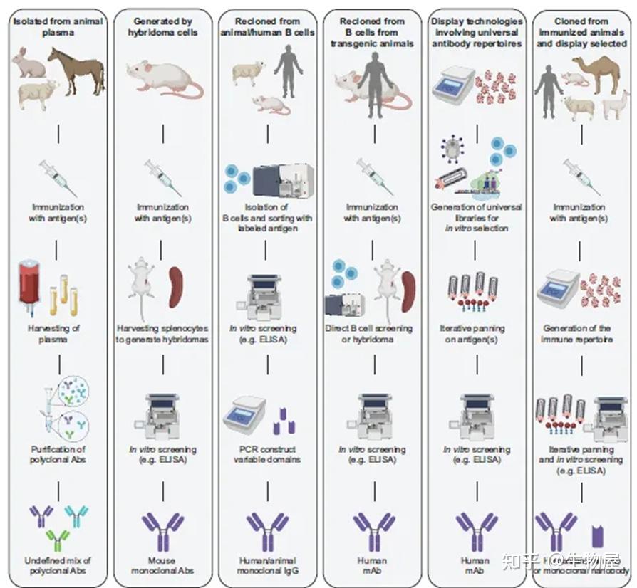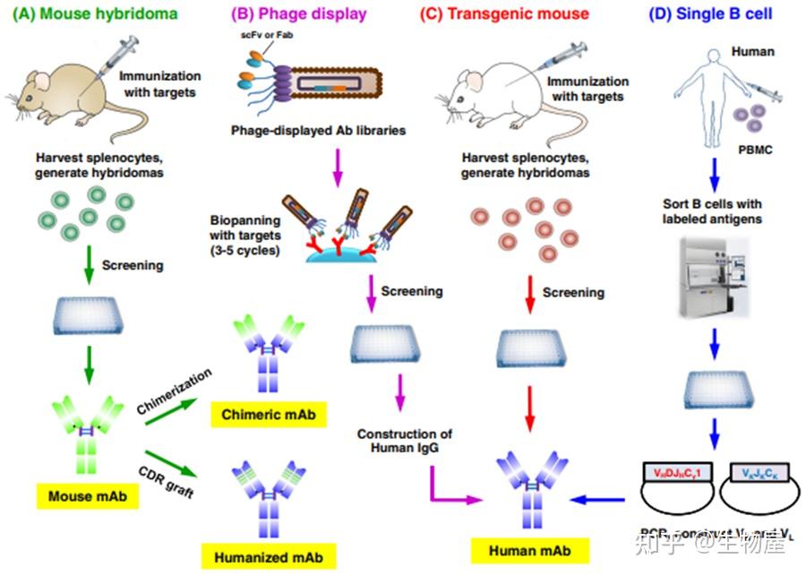a.传统的小鼠杂交瘤技术首先用所需的抗原对小鼠进行免疫,以触发免疫反应。采集的脾细胞与骨髓瘤细胞融合产生持续分泌抗体的杂交瘤细胞。筛选后,选定的引线用于产生嵌合或人源化抗体。b.噬菌体展示。人类噬菌体显示的人类抗体文库用于选择感兴趣的抗原。经过3-5轮生物筛选,ELISA筛选免疫阳性噬菌体克隆;然后分析DNA序列以构建和表达人IgG。c.转基因小鼠。类似于小鼠杂交瘤技术或单B细胞方法。d.单B细胞技术。从受感染或接种疫苗的供体中制备PBMC,用流式细胞术分离合适的B细胞。