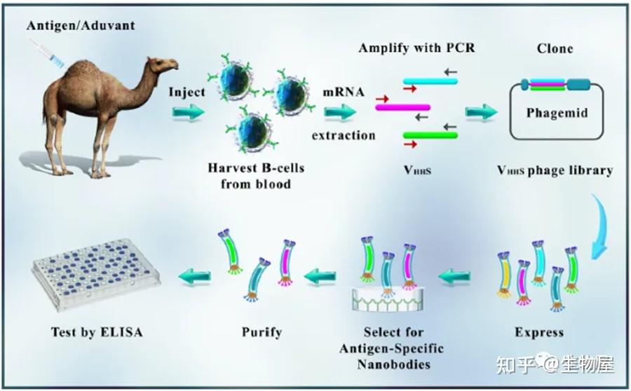从免疫骆驼血分离淋巴细胞中提取mRNA,这些B细胞的mRNA经PCR扩增转化为cDNA。将PCR扩增产物连接到噬菌体载体上。为了构建VHH文库,将连接的DNA材料转化为大肠杆菌。用于感染细胞的M13辅助噬菌体。这些被感染的细胞产生了与尖端蛋白III融合的Nb蛋白噬菌体颗粒,它们也在病毒粒子内产生了具有Nb编码序列的噬菌体颗粒。这些病毒粒子与固定抗原在免疫管中孵育,去除非结合和多余的噬菌体颗粒,经过连续的生物筛选,通过ELISA鉴定出靶向特异性Nbs。