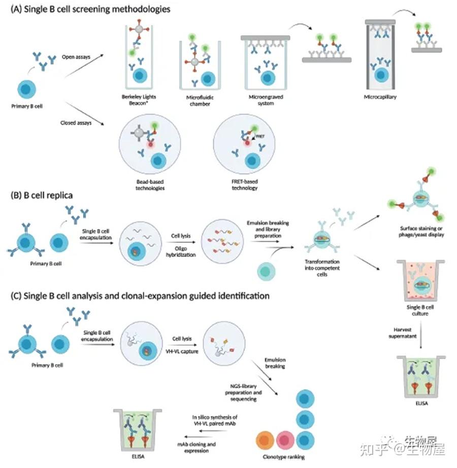 o (A) 单个B细胞筛选方法。通常,ASC与这些技术一起使用,因为它们都依赖于分泌抗体。另外,激活记忆B细胞也可以使用。我们把方法分为开放试验和封闭试验。开放的检测方法包括Beacon (Berkeley Lights)技术、微流控室、微雕刻系统和微毛细管系统,封闭分析包括所有依赖于单个细胞包封在油包水滴的方法。开放和封闭技术主要依赖于抗原特异性抗体的检测,要么通过分泌抗体和表面显示抗原的小珠的共定位,要么通过不同荧光团的共定位或通过产生Förster共振能量转移(FRET)信号来检测抗IgG捕获的分泌抗体结合的可溶性抗原。