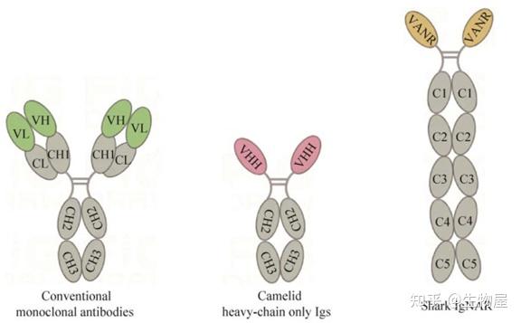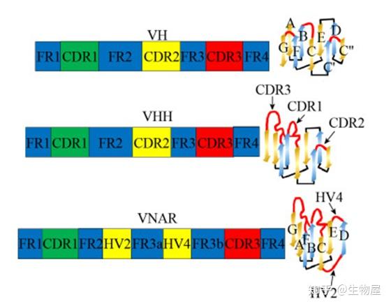 o VNAR由2个β-折叠片和8个β-链组成,FW2-CDR2的缺失导致VNAR包含CDR1和CDR3。与传统抗体相比,这些抗原结合片段平均含有更大的互补决定区(CDR),可能是为了弥补可变轻链结构域CDR的缺失。