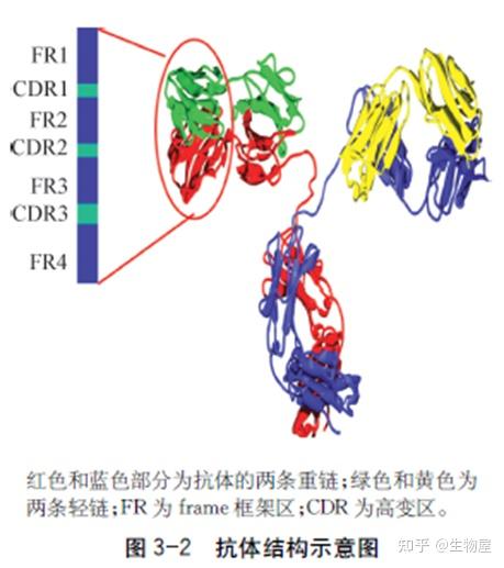 o 可变区由4个框架区和3个高变区组成,其中框架区的氨基酸比较保守,而高变区的氨基酸变化极大,又称互补决定区(Complementarity-determining region,CDR)(见图3-3),在抗体与抗原结合中发挥关键的作用,通常要予以保留。可变区除CDR区之外的框架区可以进行人源化替换,但是对于维持可变区结构的一些框架区鼠源氨基酸要予以保留,因为这些氨基酸的改变可能会改变可变区的空间结构,从而影响抗体结合抗原的能力。