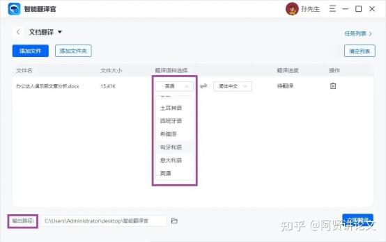 03、软件所支持翻译语言分别有英语、法语、韩语、西班牙语等,都支持与中文互译。最后,选择输出路径后就可以直接翻译啦!