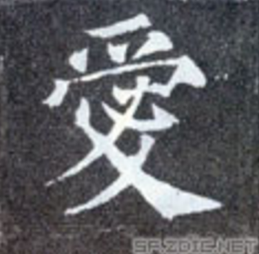 之后隶化成图F所示字形,隶化后楷书则为图G形体,主要是上半部分的变化。简体楷书的“爱”则采用行书字形,依据草书字形将正体楷书字形中的“心”和“夊”简化成“友”。楷书由中间带“心”的“爱”简写成现代汉语中的“爱”,导致了金文字形中的“欠”形部分消失和正体楷书字形中的“心”形部分消失。 [8]