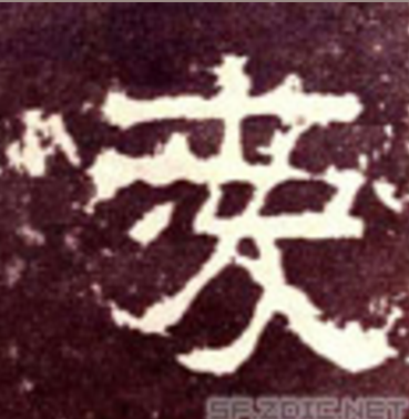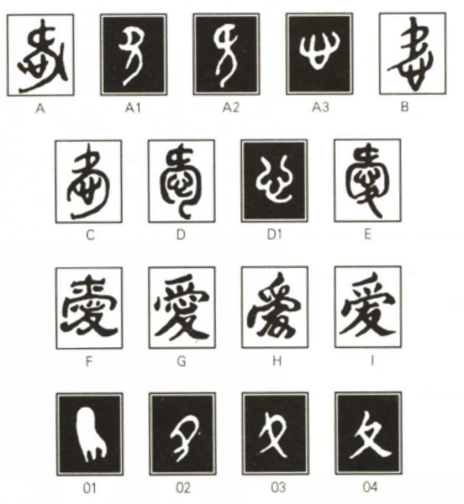 由“欠”(或“旡”)和“心”两部分构成。“欠”(图A1)和“旡”(图A2)都是端坐地上张着口的人形,“欠”的口”朝左,“旡”的口朝右。这个张口的人,用右手抚着心(图A3,图D1)以表示“张口告人,心里喜欢”的意思,这就是“爱”这个会意字,图(D)的小篆继承了金文(图C)的形体,只是把“欠”变为“旡”了。但秦始皇并吞六国以后统一使用的(图E)的小篆“爱”,字脚却多了一只向下的足(夊),以表示“爱”是一种行为与行动,反而把字繁化了。这个向下的脚即“夊”的演变流程,图01-04的形体,是一只向下的脚逐渐由实化变成线条化、笔画化。因为脚趾向下,所以表示由远而近的行动。这个“夊”不单独成字,后来作为“冬”、“处”、“各”、 “夏”等字的表意符号。 [2]