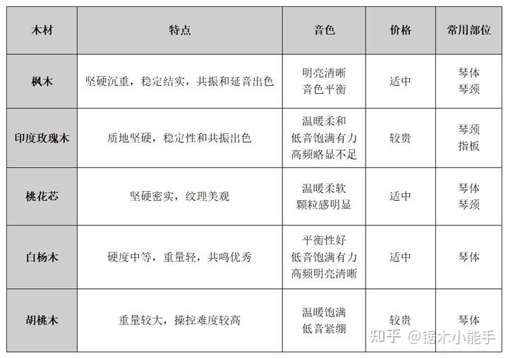 电吉他使用到木材的部位主要是琴体、琴颈和琴头。琴头的作用是承担琴弦的张力,固定调音钮,材质和造型对声音的影响基本可以忽略,所以一般用硬质的木材即可,一般各品牌都不太着重强调。 电吉他琴体、琴颈以及琴颈上面覆盖的指板,和原声吉他对材质的要求大体一致,所以木材种类大部分也是重合的。下面介绍一些入门级电吉他常用的一些木材,那些特别昂贵的比如乌木恺木等,只有高端琴才能看到,还有一些比较小众的没有列在里面。