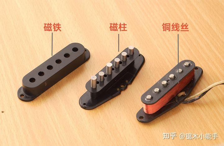 电吉他的拾音器主要由磁铁、磁柱、铜丝组成,自身会形成一个磁场,弹奏时琴弦会产生不同的振幅,对磁场进行切割,拾音器将切割磁场形成的不同信号传送到音箱,最终输出成声音,这就是电吉他发声的整个过程。