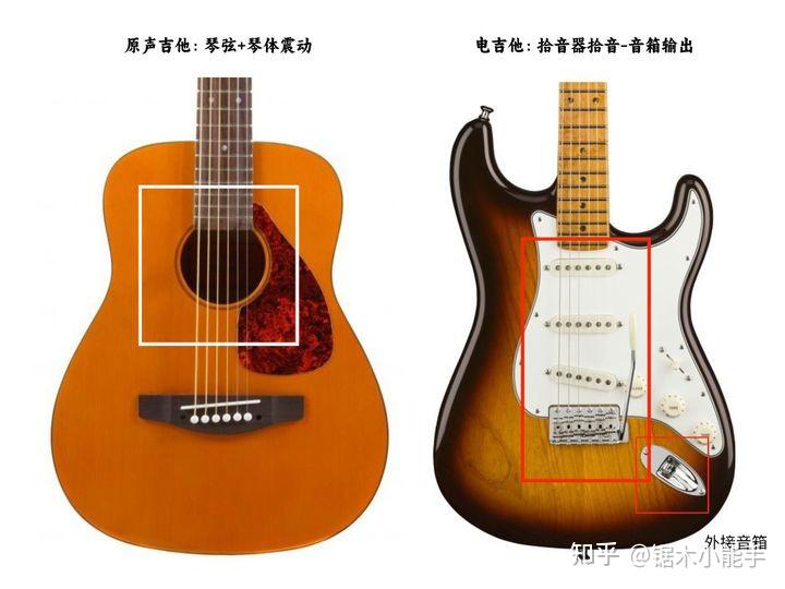 原声吉他的发声是琴弦振动产生声音,同时琴身共振使声音增大,再通过音孔传出,发声只需要琴自身就能完成。电吉他是电声乐器,发声是拾音器和音箱共同完成,缺一不可,这也是电吉他和原声吉他最大的区别点。