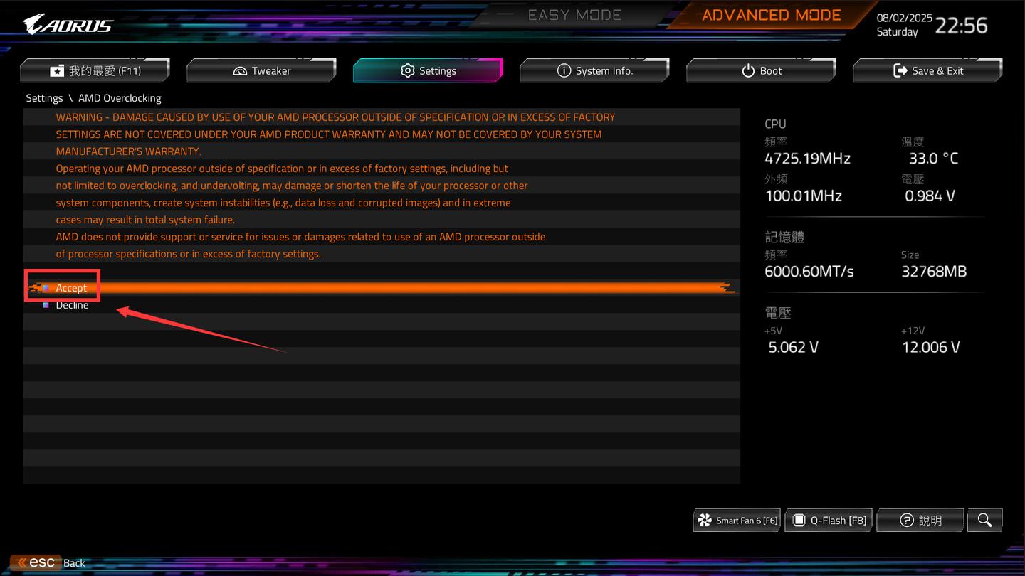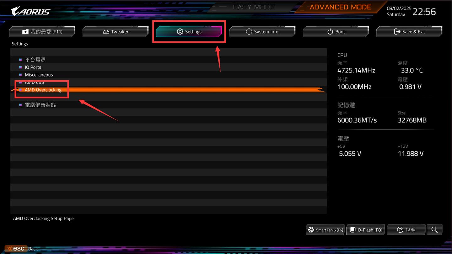 冲击极限需要使用PBO2超频,按照下图所示,切换成高级模式,进入设置页面下的AMD Overclocking。