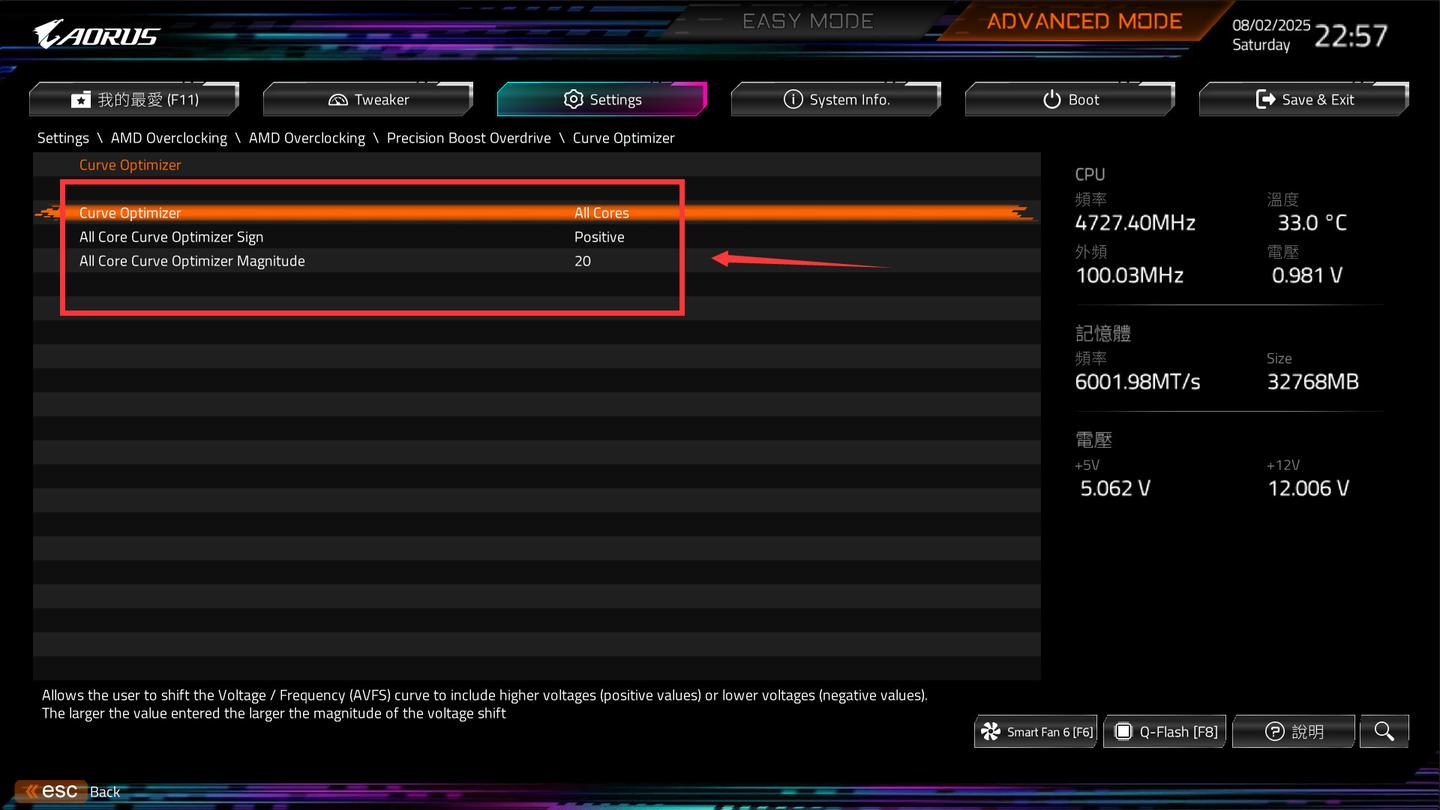 ● All Cores Curve Optimizer Magnitude正常填写20,这里是降压20,也就是降低CPU工作电压+降低运行温度。