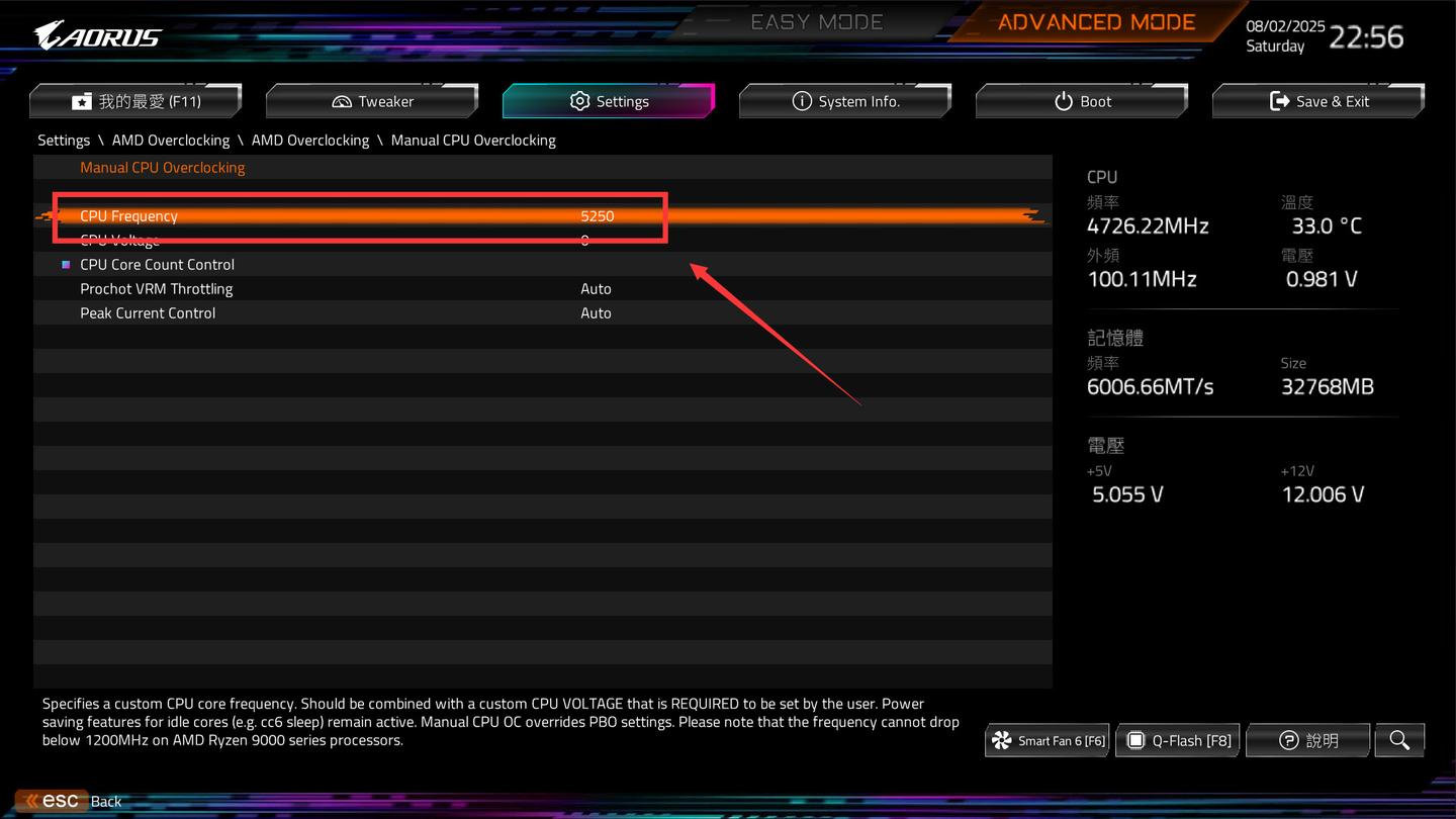 ● 如果你的CPU体质非常好,可以尝试超频填写5400(5.4GHz),这个数据也是一般零售9800X3D的极限数据。