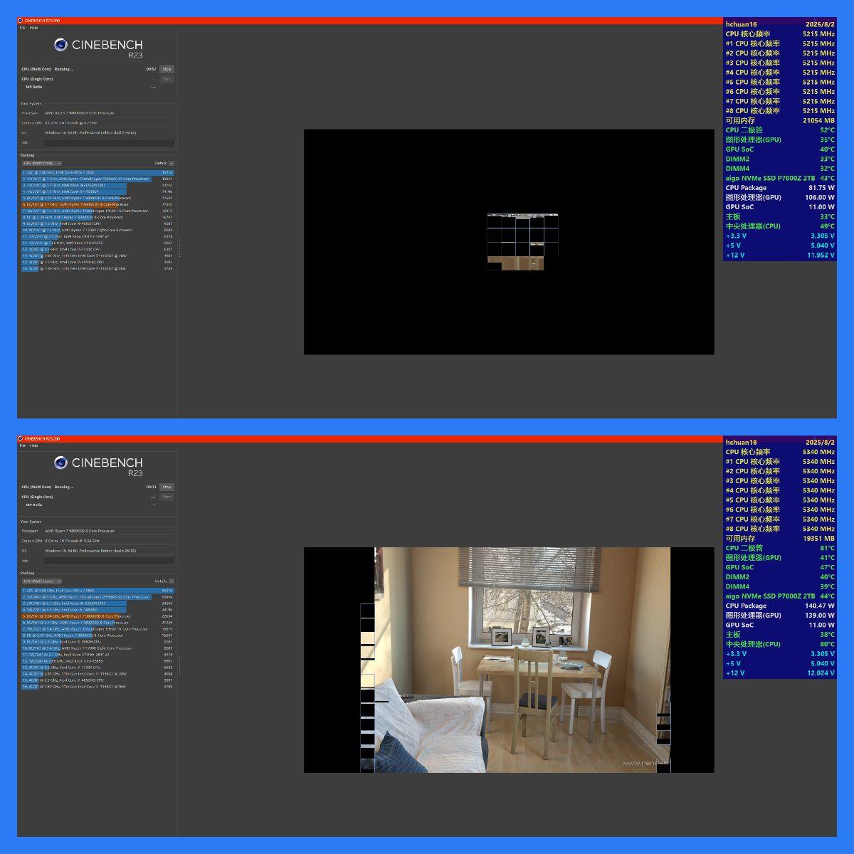 整体提升约为6.8%和7.7%,手动配置的CPU下降其实比较容易理解,内存关联的核显性能上去了,使用独显就没这个问题了哈。