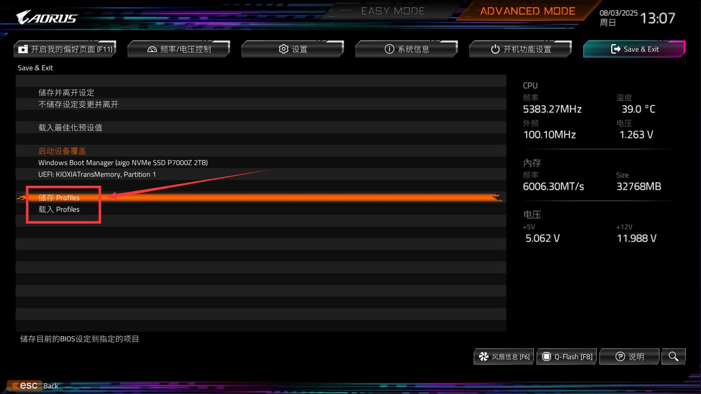 ● 点击Save&Exit页面下面的储存Profile,点进设置文件,可以保存当前的BIOS设置。