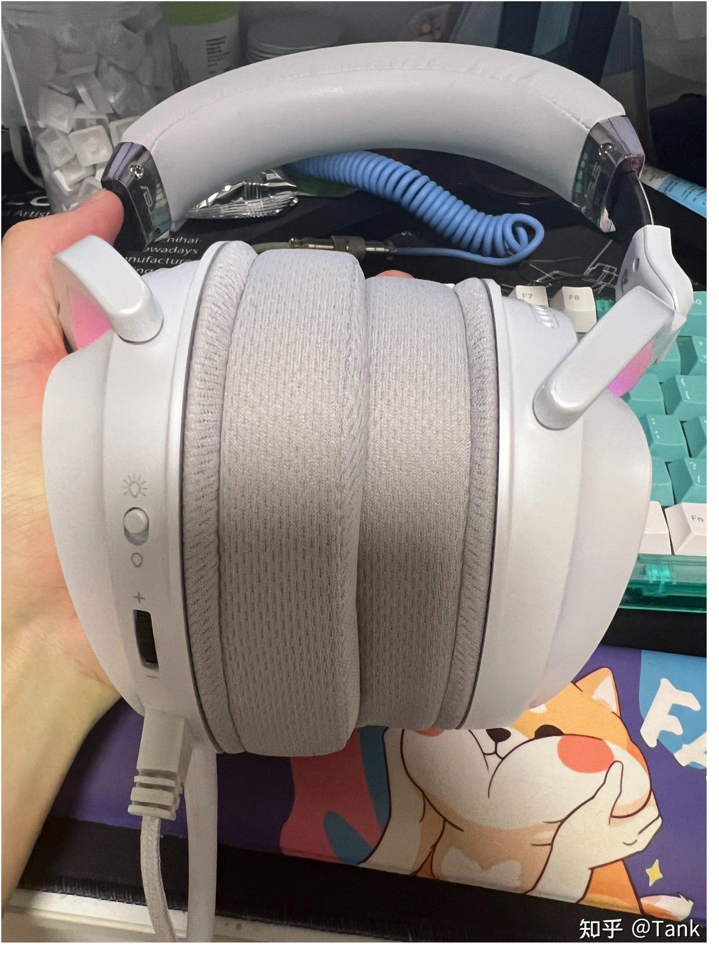 整体颜值非常高,这也是我买它的理由之一,因为我自己麦克风是白色的,白色麦克风+白色的耳机一起展示出来相同的 RGB 氛围感更棒一些。