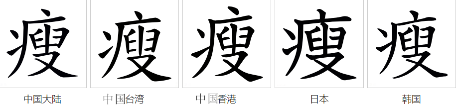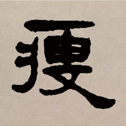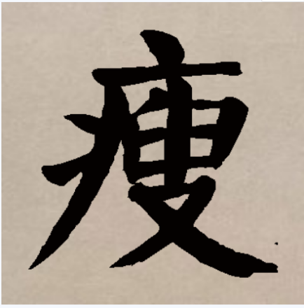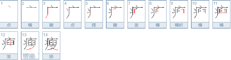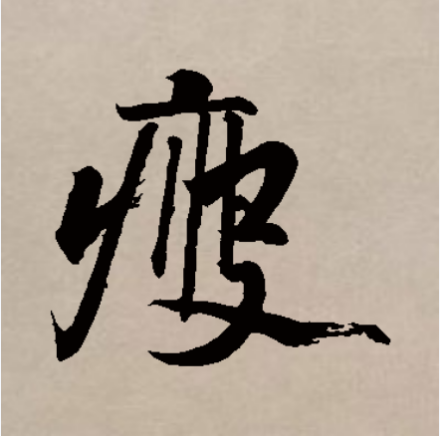 “瘦”字是半包围结构。由“疒”和“叟”两部分组成。“疒”字旁在第五笔一提完成书写。随后开始“叟”字书写,第十四笔一捺结束“瘦”字书写。