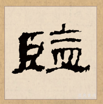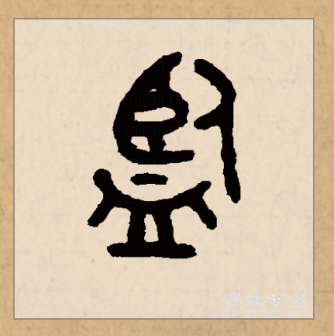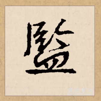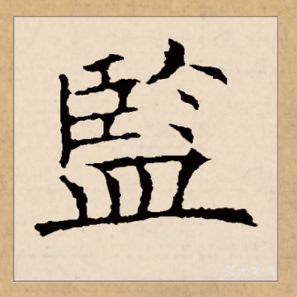 上半部分窄、大,下部“皿”宽、扁。上半部分“〢”“𠂉”分列竖中线左右;“〢”,左短右长,下端都过横中线;第5笔点收于横中线。“皿”,居下居中,上宽下窄;首笔竖与第2笔竖垂直对齐;扁框中两短竖分列竖中线左右;末笔横长而平。 [19]