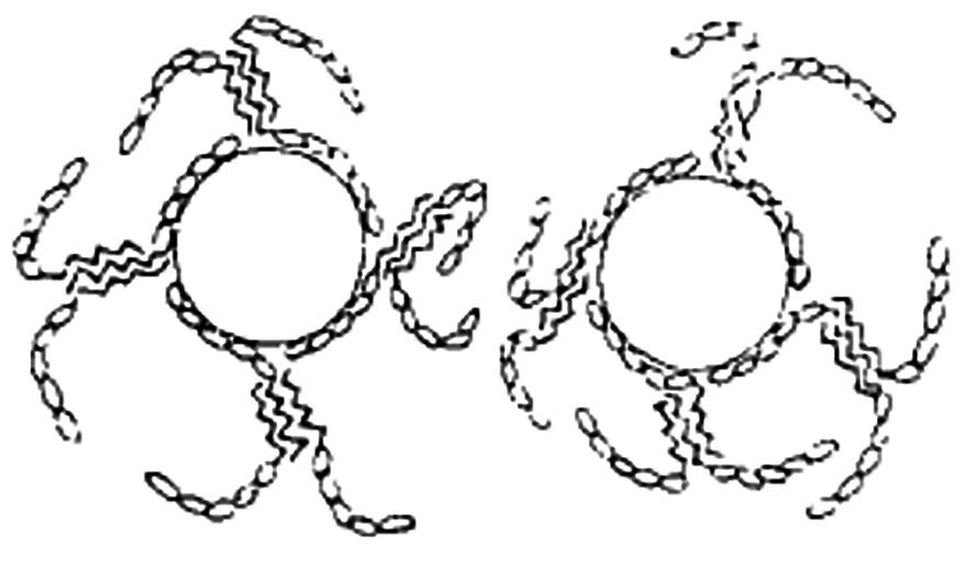 Hesselink、Vrij 和 Overbeek 等发现,在微粒分散体系中加入一定量高分子物质或缔合胶体时可显著提高悬浮液的稳定性,运用 DVLO 理论解释一些有高聚物或表面活性剂存在的体系稳定性,有时是行不通的。因为一个被 DVLO 理论忽略了的因素是聚合物吸附层的作用。在有聚合物存在的水溶液中,起稳定作用的主要是吸附的聚合物层而不是扩散层。空间位阻理论的解释是:聚合物的锚固基团吸附在固体颗粒表面,其溶剂化链在介质中充分伸展,形成位阻层,充当稳定部分,阻碍颗粒的碰撞聚集和重力沉降。高聚物或表面活性剂对固体颗粒表面性质的影响主要表现在以下三个方面:① 带电聚合物吸附的粒子表面会增加粒子之间的静电斥力,这一点同于 DLVO 理论解释。② 高聚物的存在通常会减少胶粒间 Hameken 常数,因而也就减少了范德华引力位能。③ 由聚合物的吸附而产生一种新的斥力性能-空间斥力位能,伸向溶剂的高分子链,使固体颗粒彼此之间相互排斥,提高悬浮液的稳定性,见图 2-3。