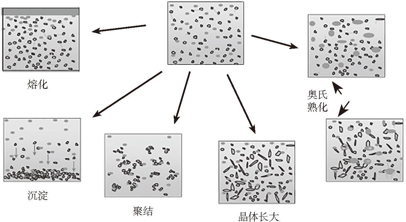 农药悬浮剂是介于液态和固态之间的一种剂型,属于多组分非均相粗分散体系。易受重力作用沉降分层,另外分散相颗粒比表面积大,具有较大界面能,有自动聚结的趋势,属于动力学和热力学不稳定体系。因此,悬浮剂在存放过程中易发生分层、絮凝、沉淀、晶体长大等现象(图 2-1),悬浮剂的稳定性,尤其是长期物理稳定性,一直以来都是一个相当棘手的问题。如何保持悬浮剂在贮存期间的稳定性,以及如何预测和评价农药悬浮体系的物理稳定性,是农药悬浮剂配方研究与加工中一个极为重要的问题,它既涉及基础研究,又涉及助剂的开发、加工工艺和设备的改进、检测技术和方法的建立、完善等。
