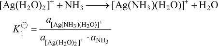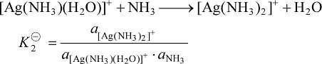 自由的金属离子在溶液中非常罕见,金属离子周围通常都有溶剂分子,它们将与配体发生竞争作用而逐步被配体取代,实际上这种取代反应是分步进行的,在溶液中有各级配离子存在。如在含 Ag+ 的溶液中加入氨水,则二氨合银配离子可按下面两个步骤生成:
