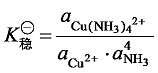 式中,a表示各质点的平衡活度。这个平衡常数称为 [Cu(NH3)4]2+ 的热力学稳定常数 (或生成常数),此常数越大,说明生成配离子的倾向越大,而解离倾向越小,即配离子越稳定。由此可见,稳定常数 (stability constants) 是衡量配合物稳定性大小的尺度。