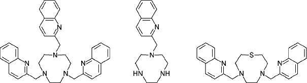 加载中... 引申出来的半整数法和罗索蒂 (Rossotti) 所改进的图解法。这两种方法主要针对的是单核、单配体的体系。随着计算机科学的发展,采用了最小二乘法、HOSK 法等数据处理方法。2009 年,V. Lippolis 等[3] 报道了下列 3 个带臂大环配体 (图 6-1) 对 Zn2+ 的荧光识别研究,文中作者用电位法测定了配合物的稳定常数。