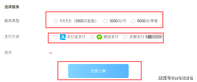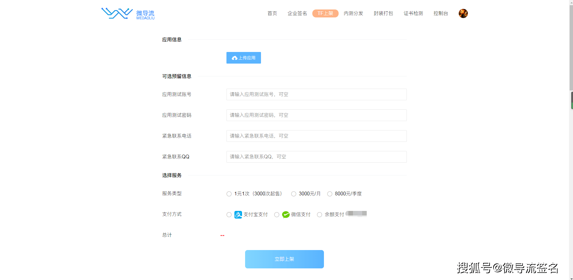 4、上传需要TF签名的规范应用,选择服务类型进行购买。微导流TF上架支持按次购买下载次数,用户可以按需购买,点击【立即上架】