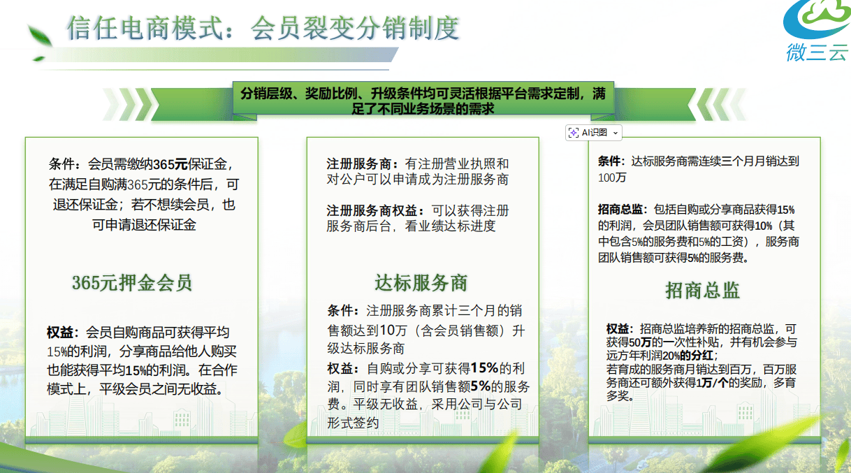 - 针对泡沫与传销风险:采用合规分销制度。会员端只需缴纳可退还的保证金,享受自购优惠和严格限定的一级分销;团队端必须公司化运作,公对公结算,从根本上规避了拉人头和团队计酬的涉传风险。