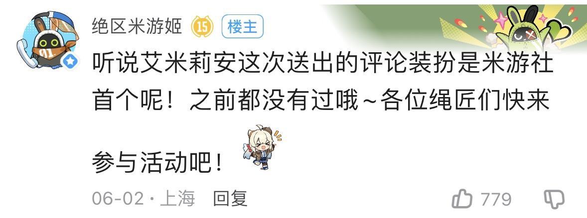 米游社设有帖子评论功能,玩家们可以通过参与征稿活动时,可以绑定对应游戏角色 [11];同时,玩家们可以把评论区图片添加为自定义表情包, [12]表情包的翻页方式优化成了上下滑动 [14]。并且评论区中设有不同的UI模组,装扮功能 [13]。