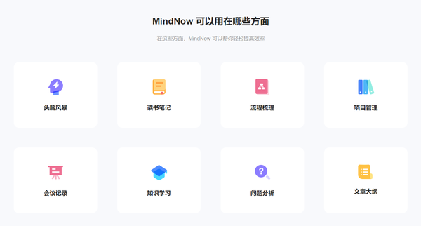 利用MindNow,可以随时随地记录头脑风暴、读书笔记、流程梳理、项目管理、会议记录、知识学习、问题分析和问题大纲,每个功能都能直接提高效率!