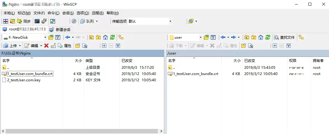 在 WinSCP 文件传输界面的左侧窗格中,选择本地计算机存放文件的目录,如 F:\SSL证书\Nginx,选中待传输的文件。