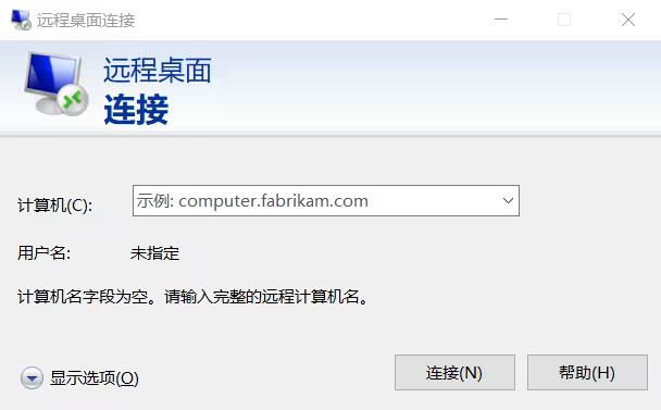 2.4、在本地 Windows 计算机上,单击,输入 mstsc,按 Enter,打开远程桌面连接对话框。如下图所示:
