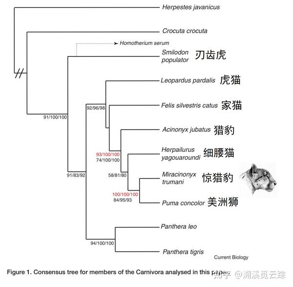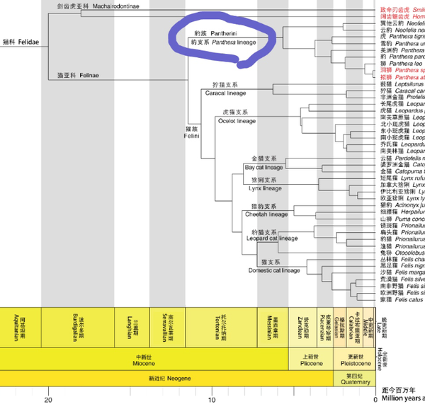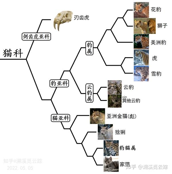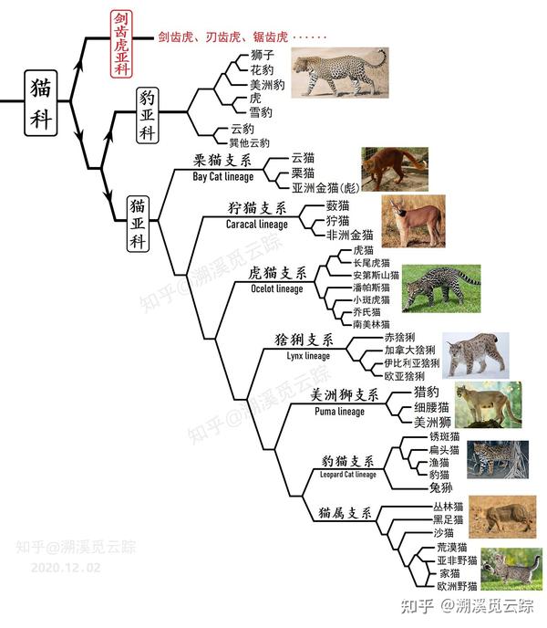(2023.5.14补充:最新消息,2023年的新文章[论文链接]把“豹亚科”降级为“豹族”,原来的“猫亚科”降级为“猫族”,和豹族一起组成新的“猫亚科”,和剑齿虎亚科并列,