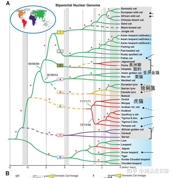 [2]猫科的亲缘关系:LiG.; DavisB. W.; EizirikE.; MurphyW. J. (2016). "Phylogenomic evidence for ancient hybridization in the genomes of living cats (Felidae)".Genome Research. 26 (1): 1−11.