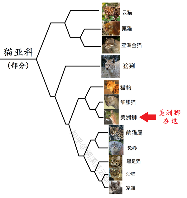 所以,美洲狮和猎豹是近亲,它俩都属于猫亚科的美洲狮支系,不过它俩只是同一个支系,但并不是同一个属,支系比属大。