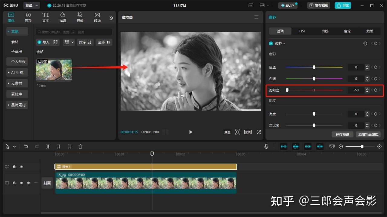步骤二,可以添加“自定义调节”图层对图片进行调色,也可以直接选中轨道上的素材,然后进行调色,三郎老师使用“自定义调节”图层,为了突出对比效果,我把“饱和度”调到最低,使其变成黑白的效果,如下图所示;