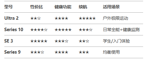 - 预算2000元以内:Series 10(国补版) 性价比炸裂!血氧、ECG、eSIM全配齐,补贴后仅1874元,比SE 3还便宜。