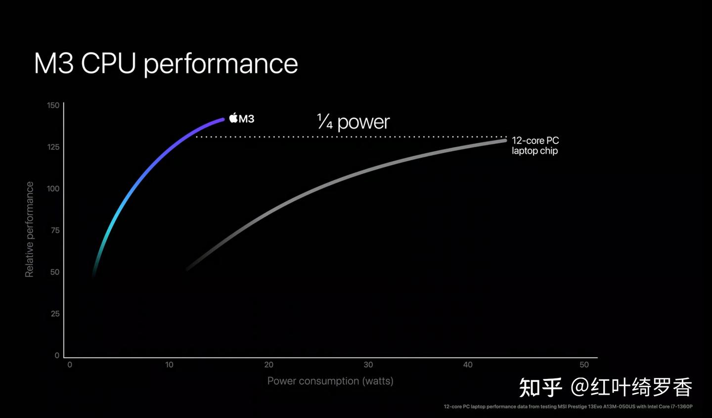 实际上,对标同类笔记本,M系列芯片基本只要1/4甚至1/5的功耗,就能达到同样的性能了。