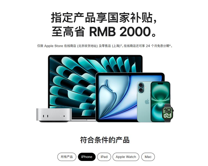 打开苹果官网,首页就可以看到:指定产品享国家补贴,至高省 RMB 2000。