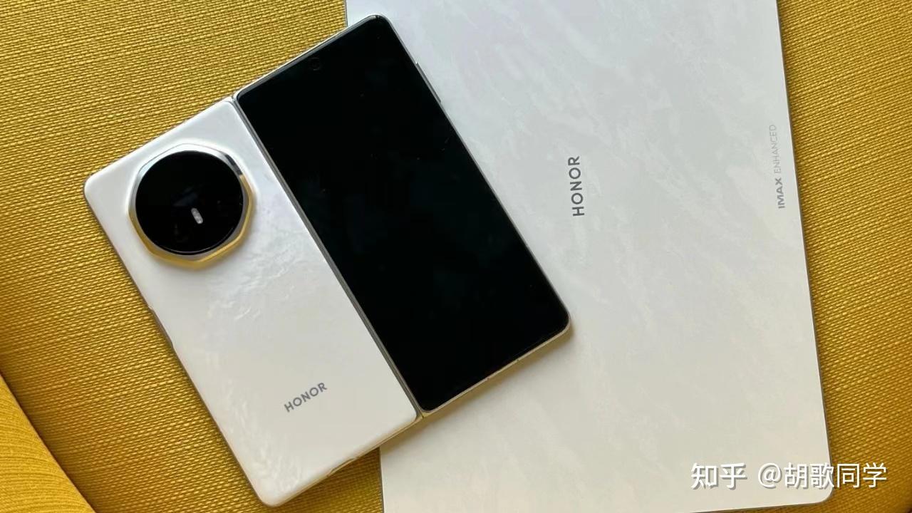 整机配置非常强的前提下做到了极其轻薄的厚度和重量,这么拿起来会发现荣耀这款产品和超大杯机型真的没有什么明显的区别,就是这么拿肯定还会感觉重一点点,但整机的感觉上已经不会有折叠屏、直板机这种差异了,所以它在轻薄这方面确实是比较不错的。