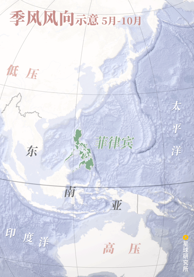 而在其北部,每年11月至次年4月,来自西北方向欧亚大陆的季风受地转偏向力作用发生偏折,转而从东北方向菲律宾袭来。