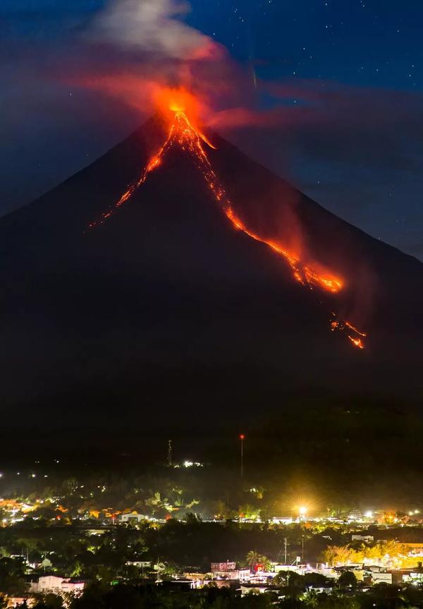 火山脚下的城市灯火通明,很难想象距其上一次喷发仅不过一年时间。