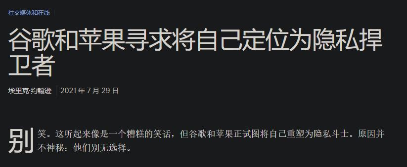 因为长期和 “ 隐私黑洞 ” 谷歌合作,外网上苹果一直被某些 “ 隐私卫士 ” 当成靶子打。