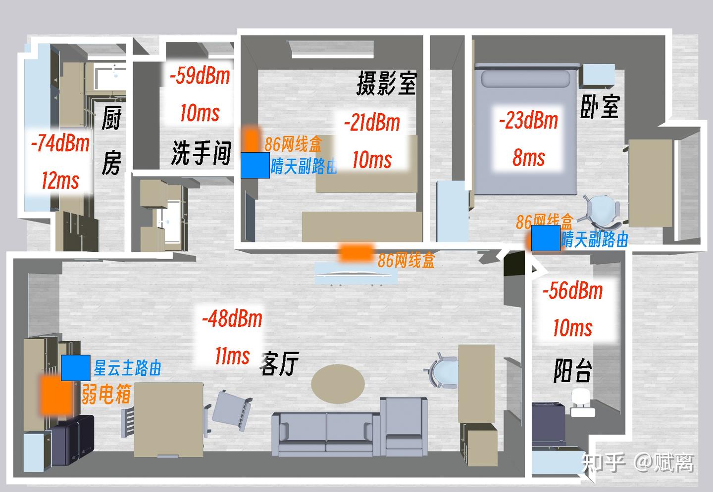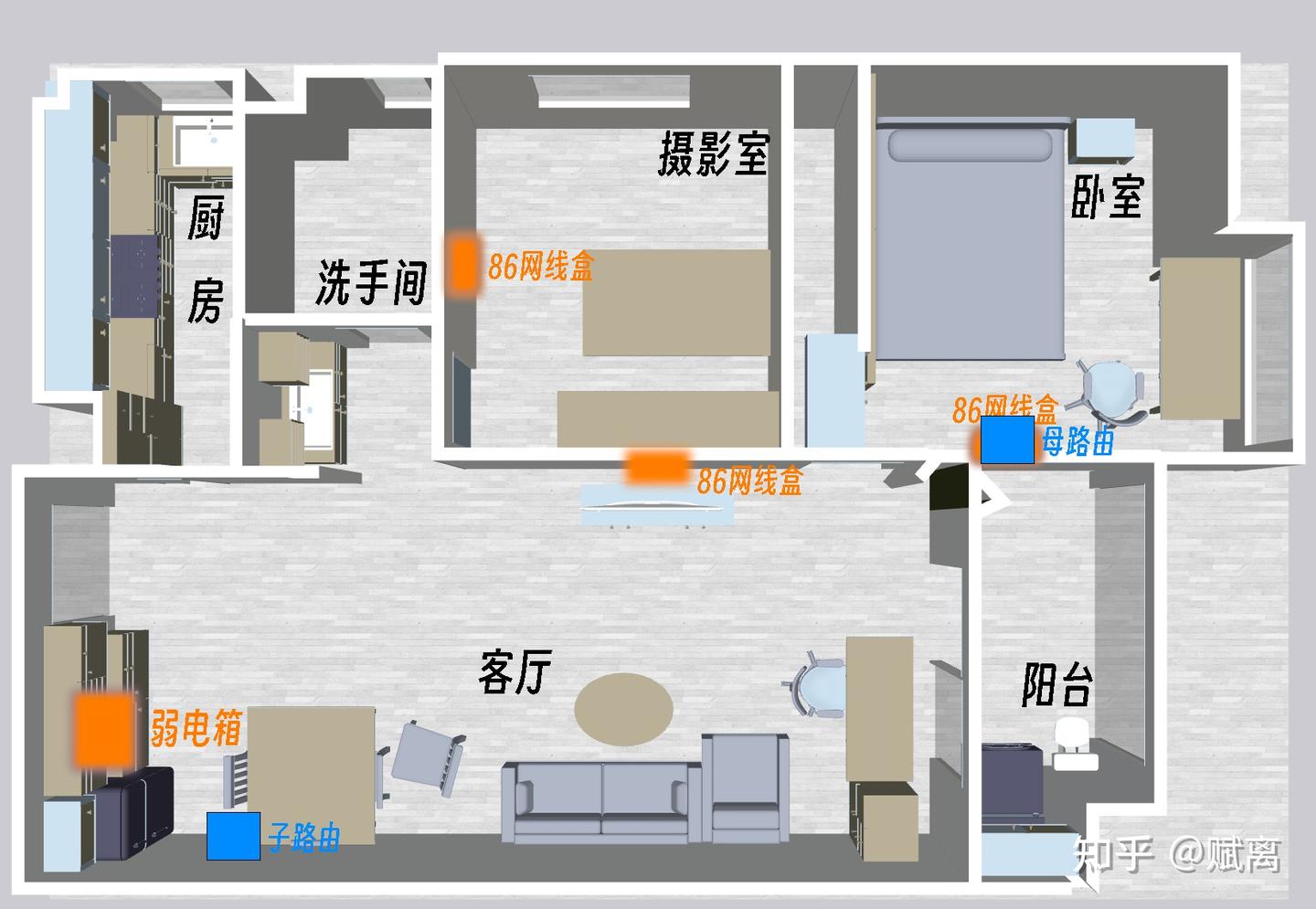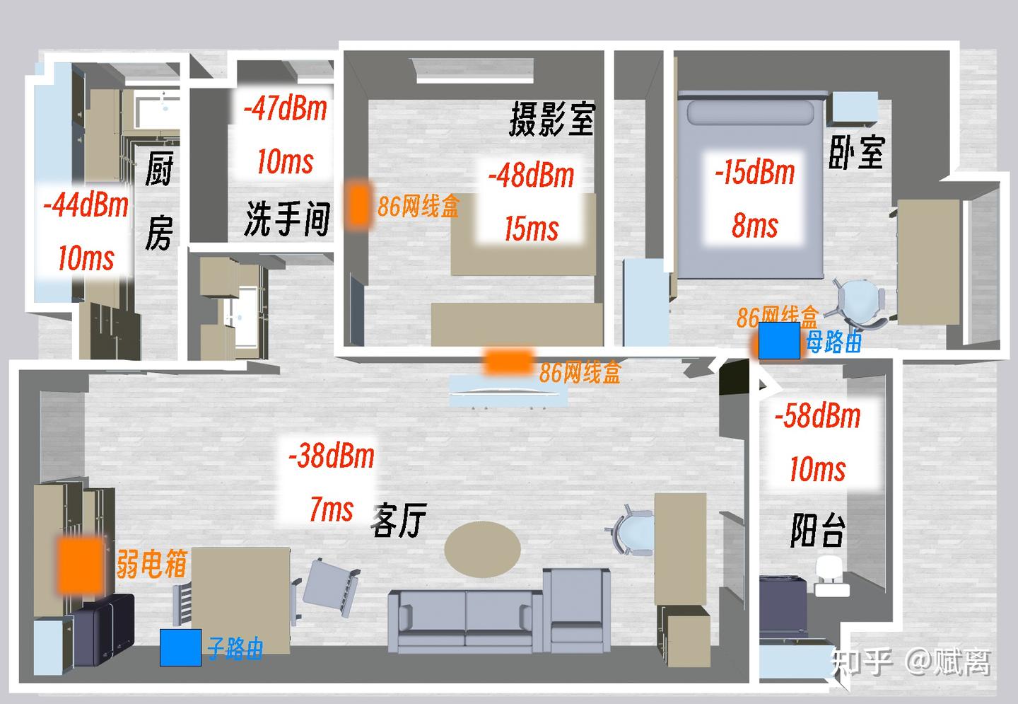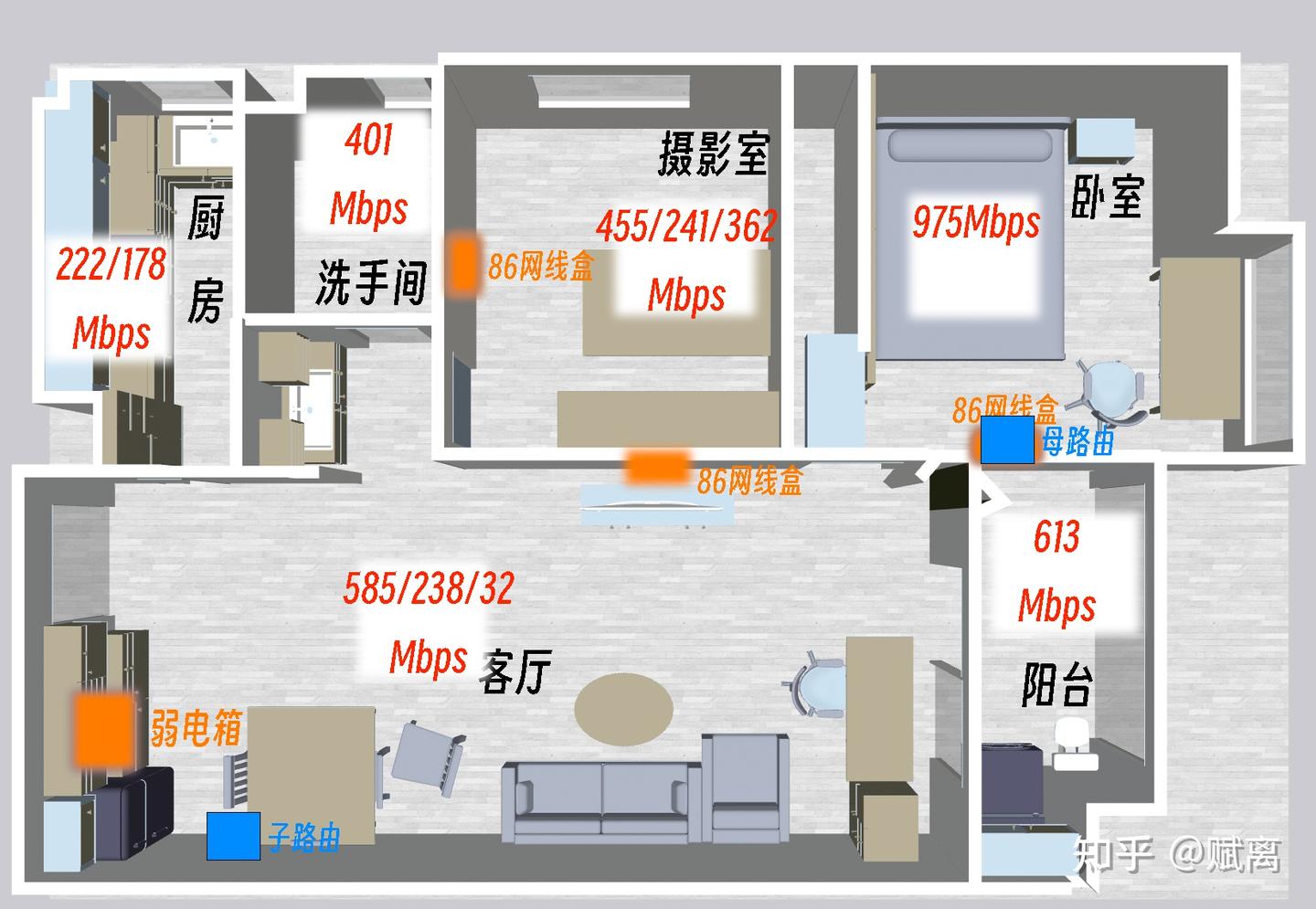 听起来很完美,但有线Mesh的难点在于很多人装修时没有预埋多条网线,这样主路由放在入户的弱电箱,直接就损失了一小半的信号(信号覆盖可以粗略想象成一个以路由器为中心的面窝,放在入户处直接就被墙吃了一小半,还会干扰邻居信号)。如果从弱电箱扯一根网线到卧室或者客厅连接次路由,实在不算美观。