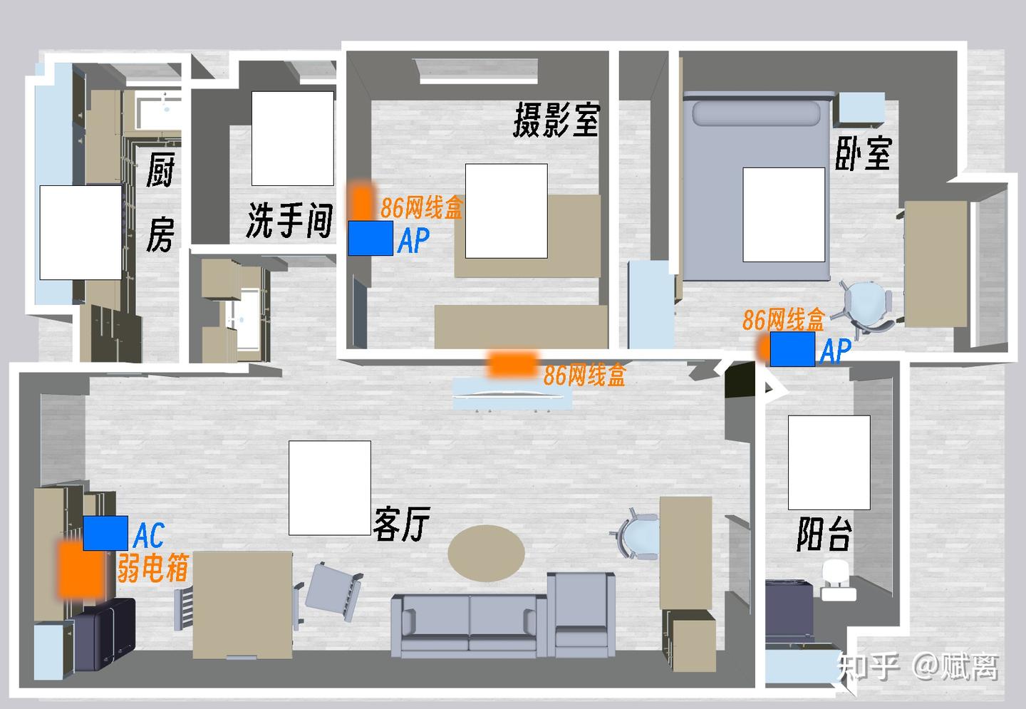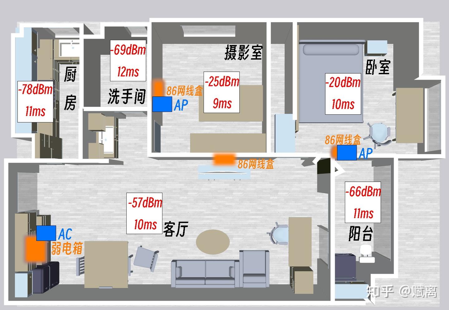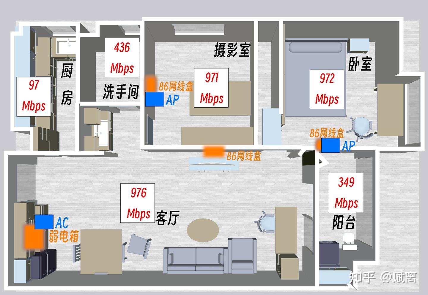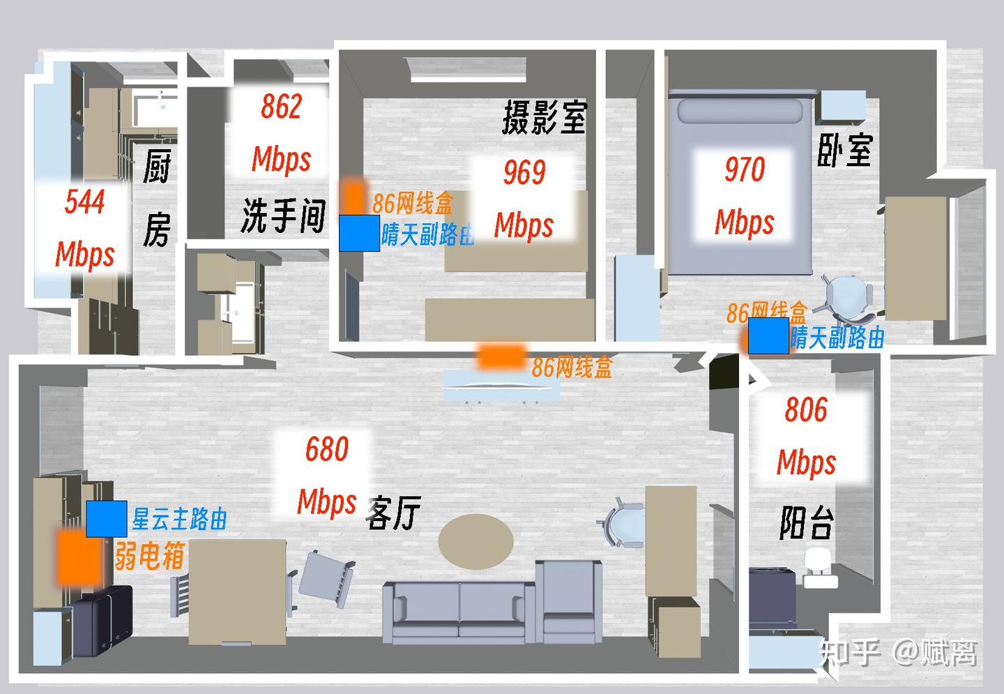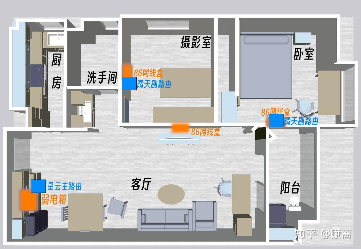 听起来很完美,但有线Mesh的难点在于很多人装修时没有预埋多条网线,这样主路由放在入户的弱电箱,直接就损失了一小半的信号(信号覆盖可以粗略想象成一个以路由器为中心的面窝,放在入户处直接就被墙吃了一小半,还会干扰邻居信号)。如果从弱电箱扯一根网线到卧室或者客厅连接次路由,实在不算美观。