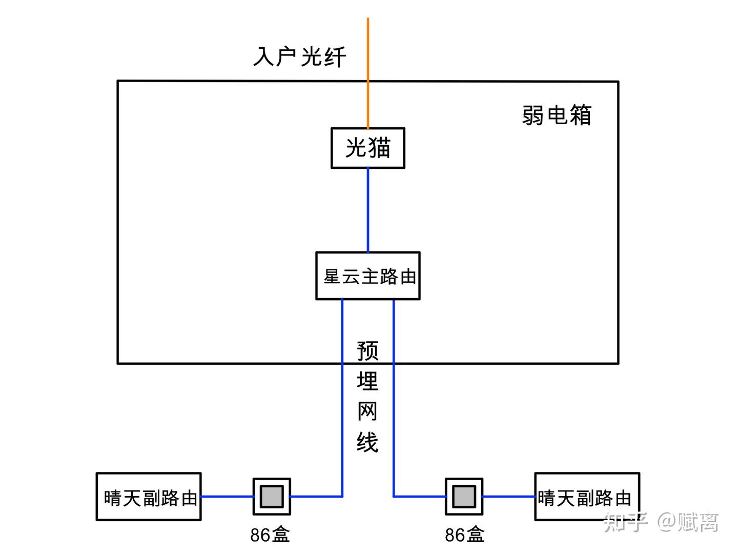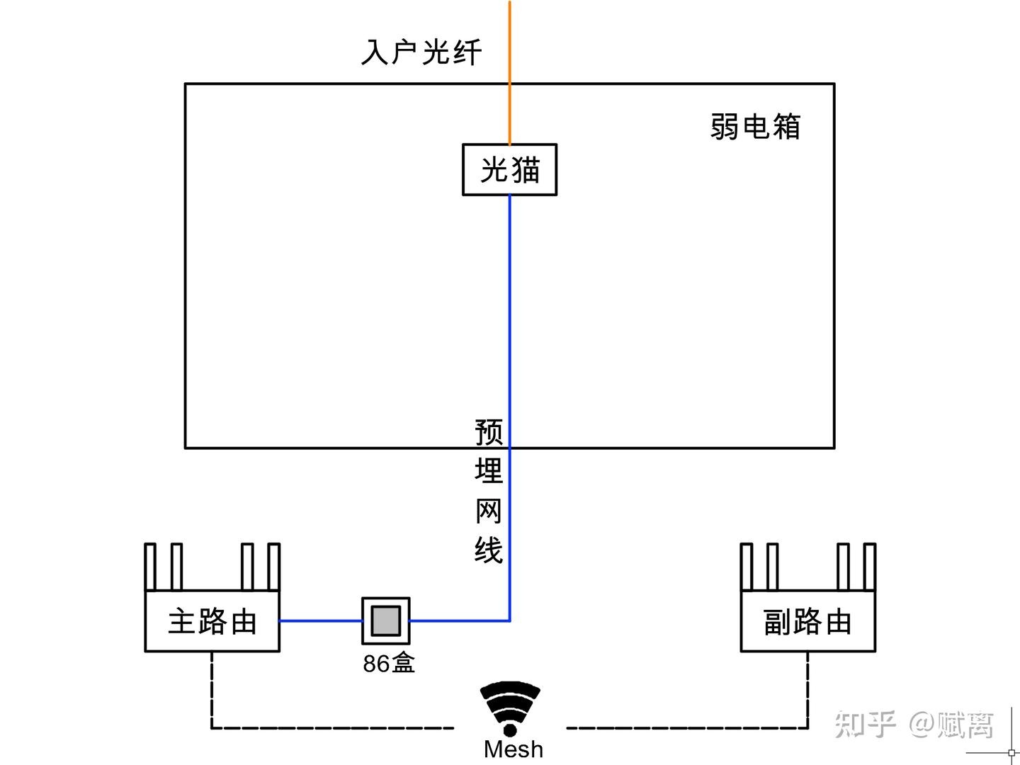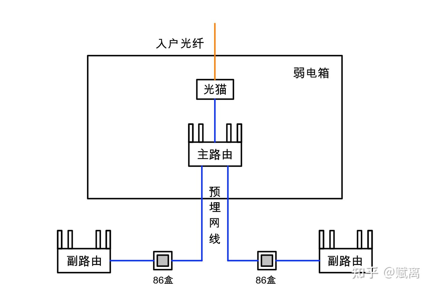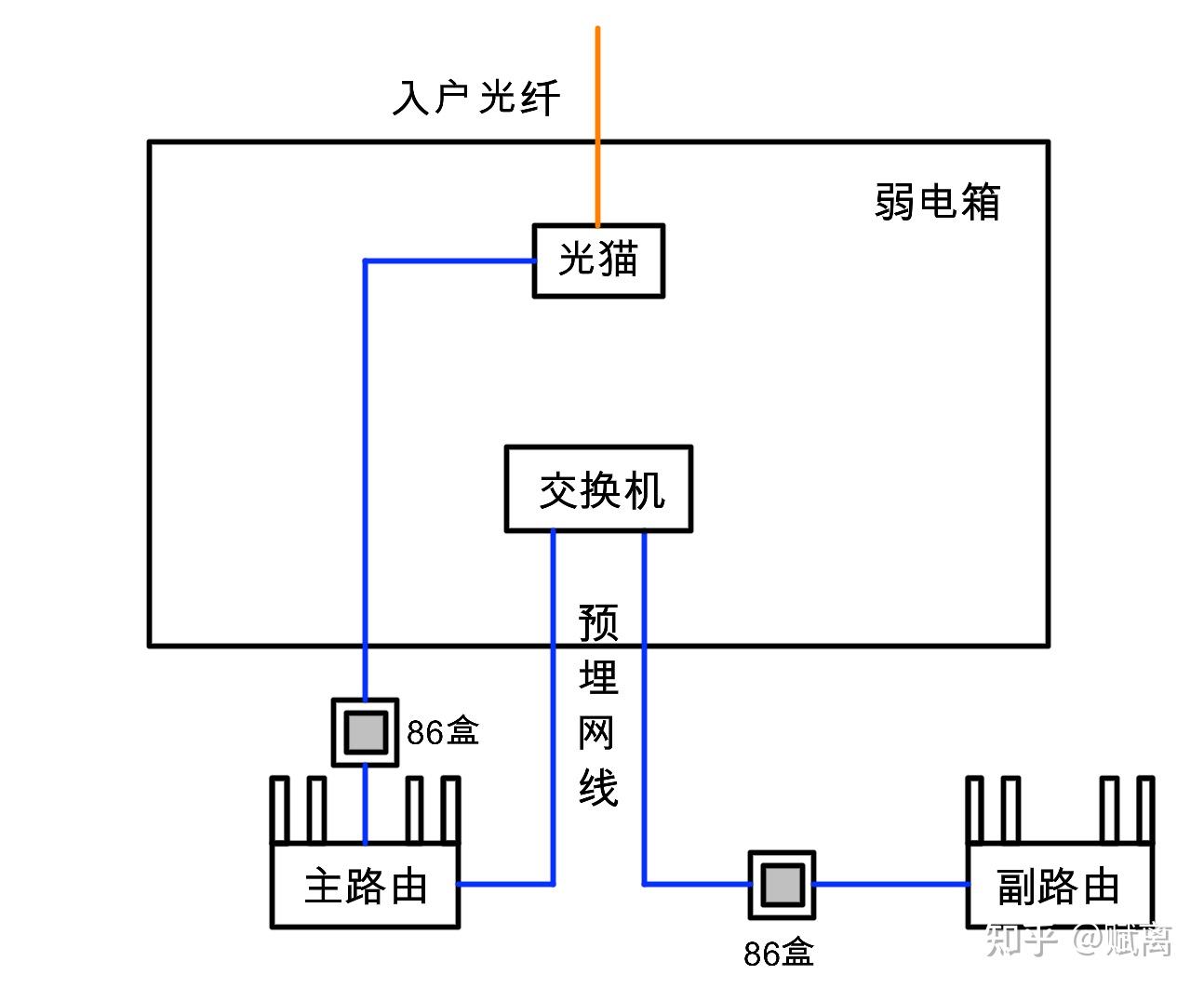 将价格最高信号最好的主路由放在弱电箱相当浪费,因此有线Mesh的理想情况是客厅(房屋中央)有两根预埋网线,弱电箱的光猫通过墙内网线连接客厅主路由,主路由通过网线连回弱电箱的交换机,再通过交换机连接各个房间的次路由,这种方案完全不会浪费性能,就是对预埋网线的要求更高了。