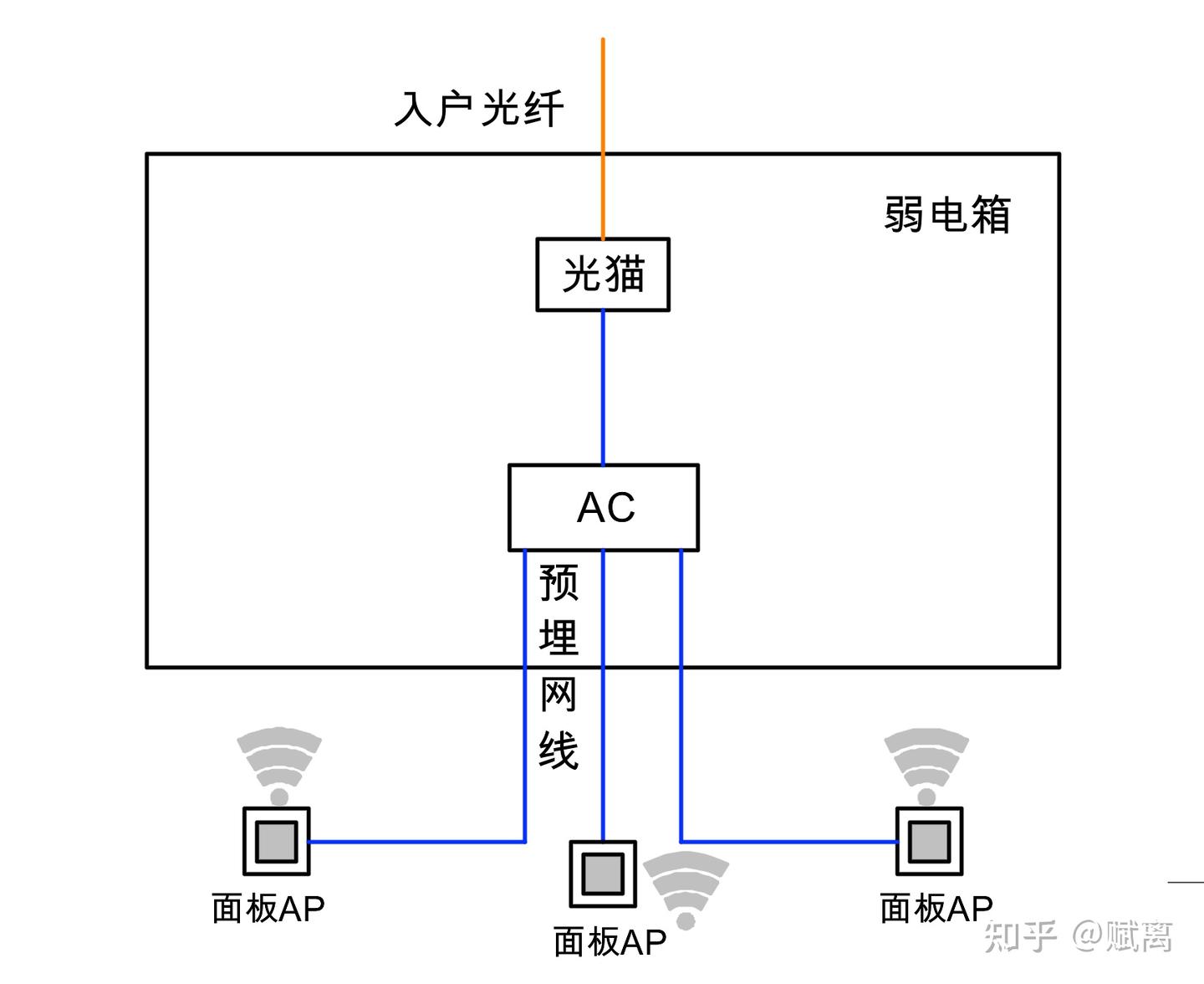 AC+AP方案是在别墅或企业场景用得最多的方案,它将拨号上网的设备(AC)和发射Wi-Fi的设备(AP)分开,AC连接光猫并插上各房间网线(房间多的话就加一层交换机),AP面板只需要连上墙上的预留网口即可实现供电(PoE)和发射Wi-Fi。手机等设备也会自动根据信号强度在不同AP之间切换,全屋都能有很好的网络覆盖。