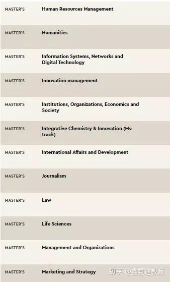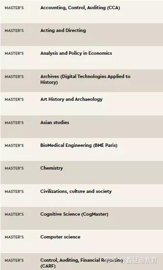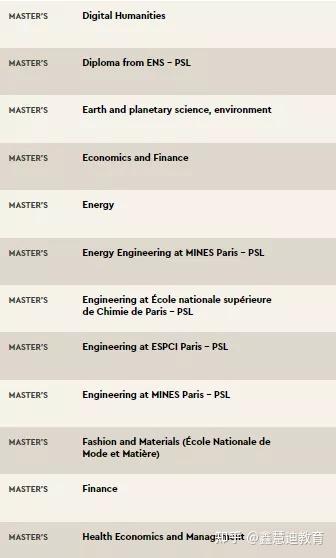 硕士阶段,PSL则有多至49个硕士专业方向可供选择,包括会计、审计、表演、经济学、社会学、生物医学、化学、计算机、档案、艺术史和考古学、能源工程、金融、时装材料学、人力资源、新闻、法律、数学、哲学、物理等专业,详细专业细分可以见下图哦!