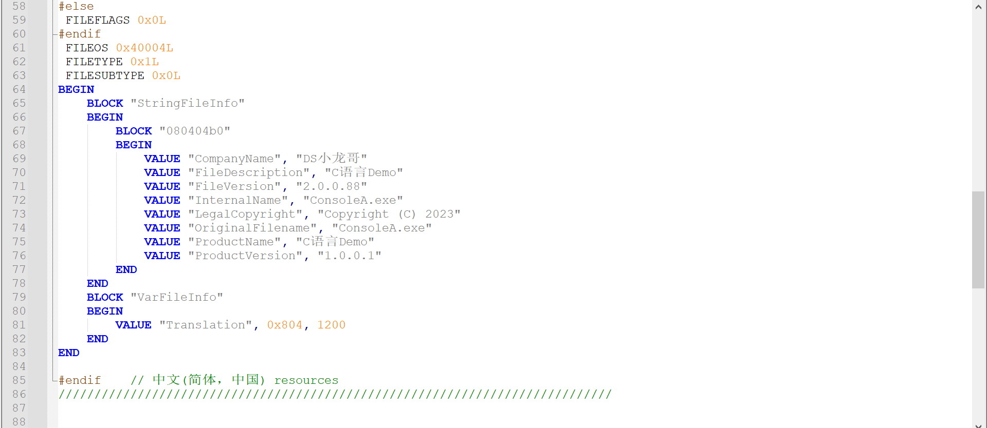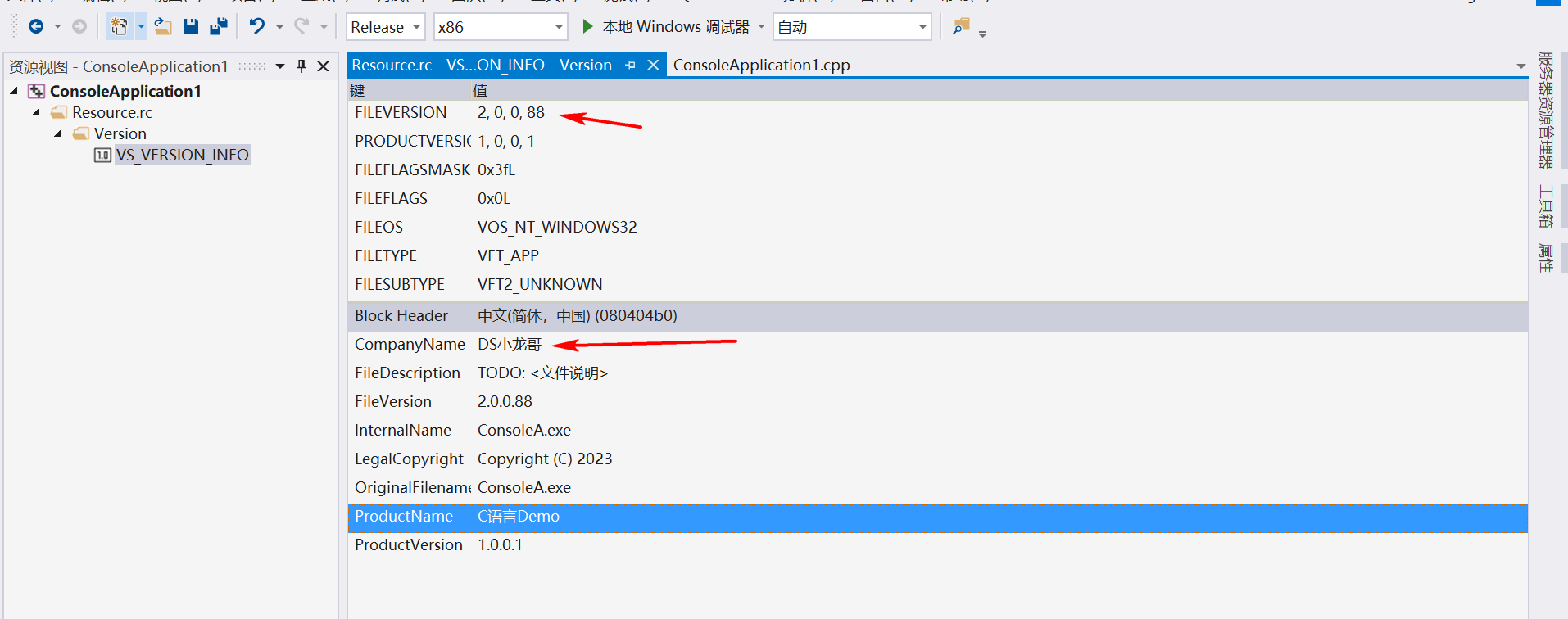 VALUE "ProductName""C语言Demo"